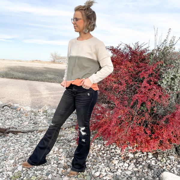 This super cute orange striped sweater is the perfect layer for a fall or winter day! The fun chunky stripes in orange, sage green, and cream add a great amount of character! Its light enough to layer up!